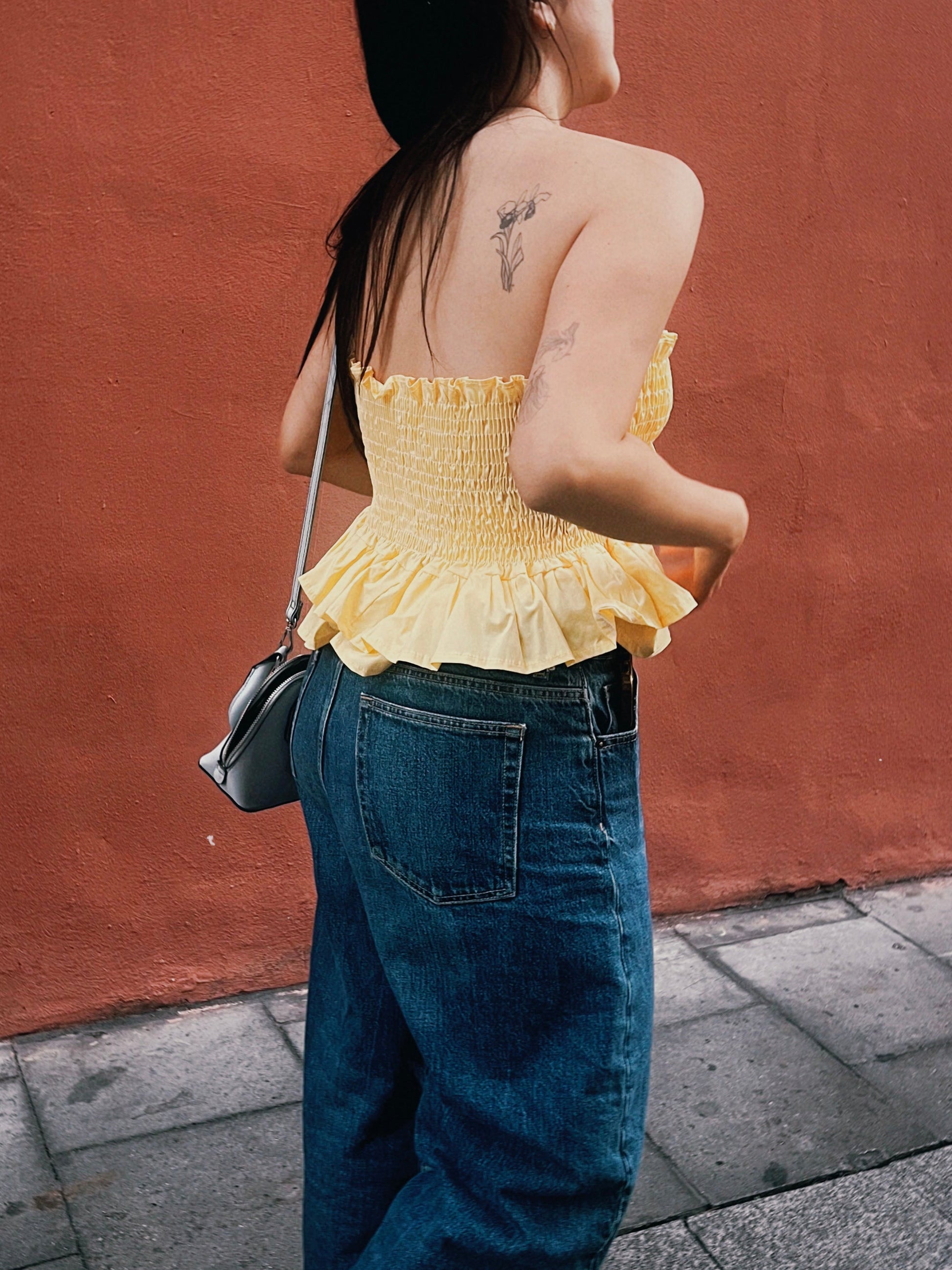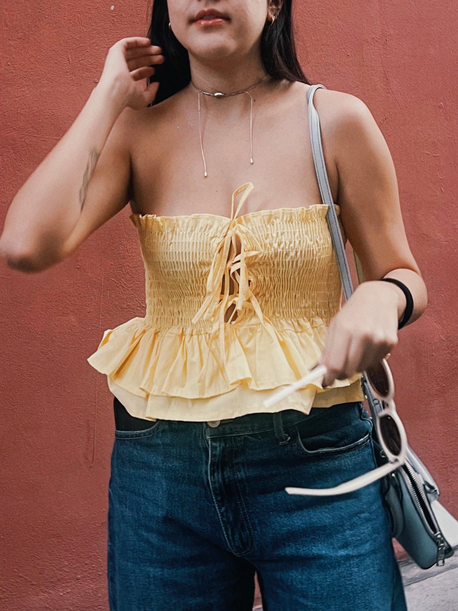 Top enrresortado de excelente elongación, con amarre delantero y doble bolero en la parte inferior de el top.